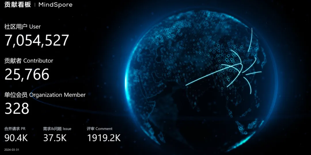 截至3月底,昇思MindSpore面向全球开发者,凝聚产业力量,持续打造人工智能创新之源。社区秉持开放透明原则,稳步建设开源生态,规模和活跃度得到持续提升。