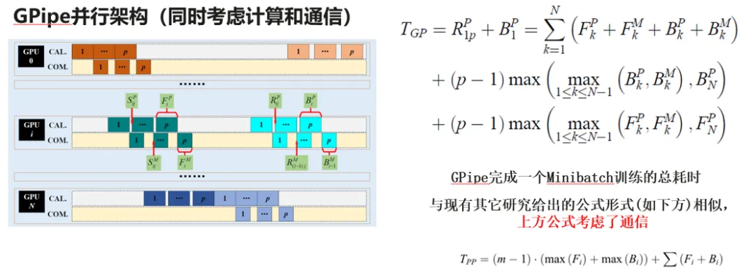 根据理论推导,建立了考虑计算和通信的GPipe并行架构的时间损失模型: