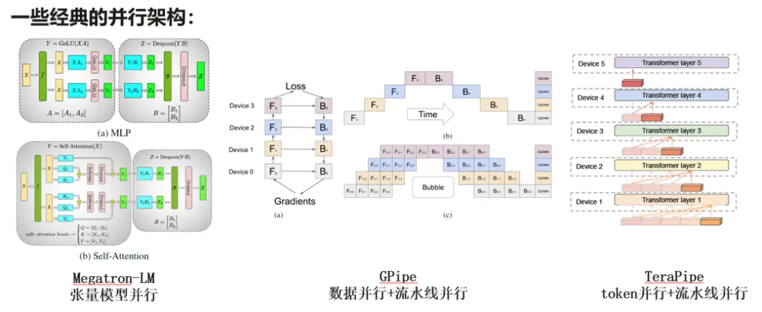 一些经典的并行架构包括了:Megatron-LM、GPipe、TeraPipe等。
