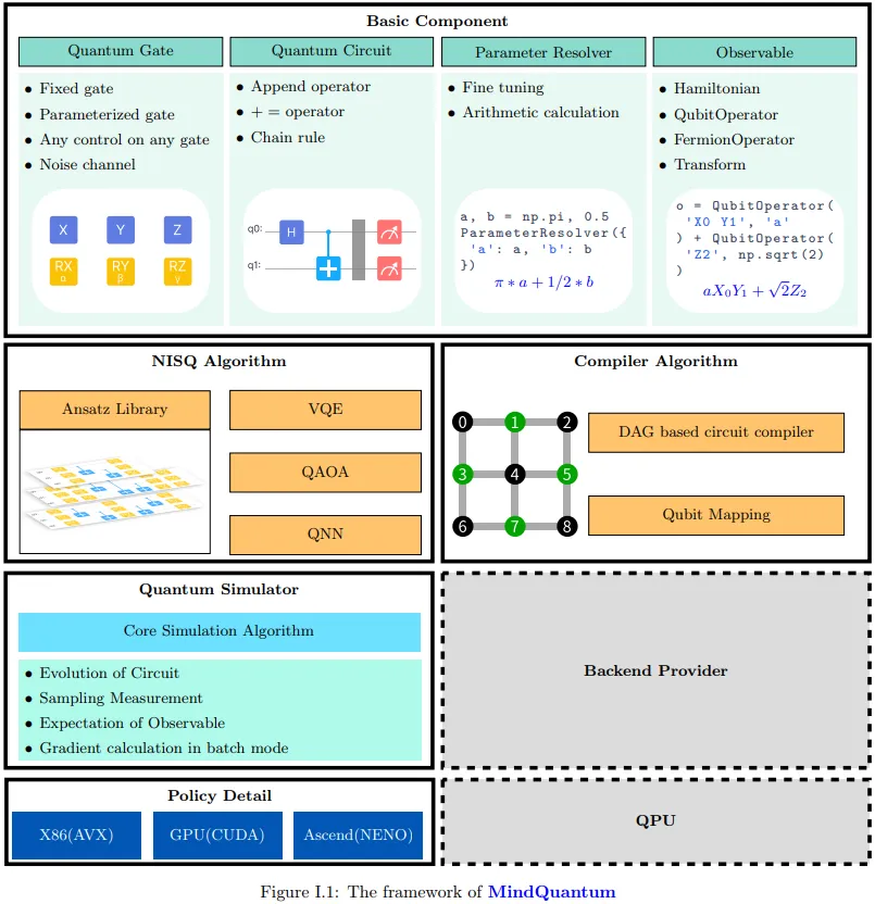 1**、**它支持多种量子计算数据类型,并提供了强大的参数解析器,包括参数生成器和解析器,以便在量子算法中灵活应用。框架中的量子门模块涵盖了固定量子门、参数化量子门以及自定义量子门等,用户可以通过这些模块构建各种复杂的量子线路。此外,框架还提供了丰富的可观测量和哈密顿量支持,包括量子比特和费米子操作符及相关的变换功能,进一步增强了量子计算的功能性与灵活性。