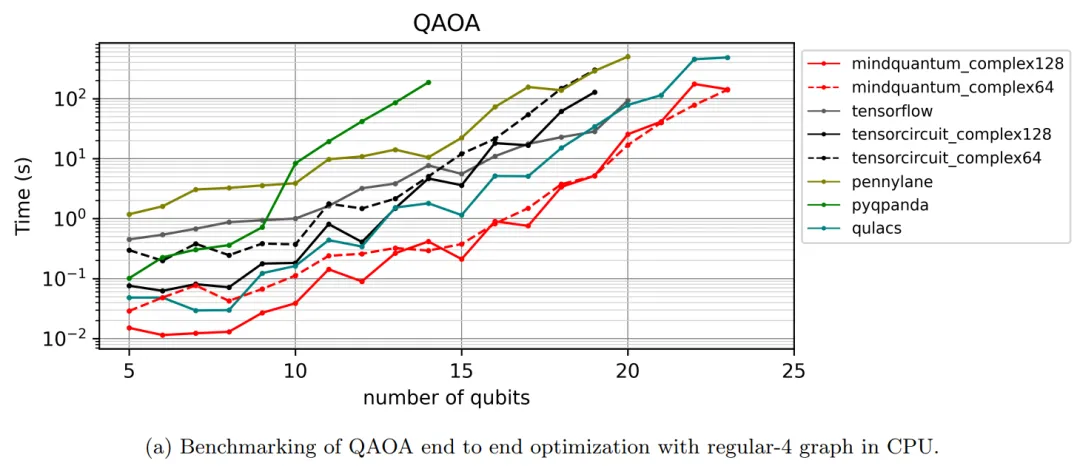 此外,我们还测试了各框架在量子近似优化算法(QAOA)任务中的表现。结果显示,MindSpore Quantum的性能比其他框架至少快一个数量级。这一优势主要是由于MindSpore Quantum在计算参数化量子线路梯度方面的深度优化,以及高效的线路演化实现。
