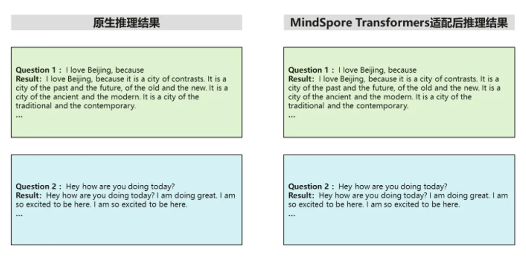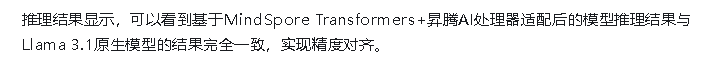 推理部署上,代码拉取、权重下载、权重转换步骤与微调一致,实现权重一键转换,推理结果显示,基于MindSpore Transformers适配的Llama 3.1模型精度与原生模型精度对齐。