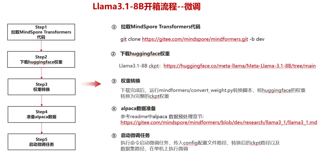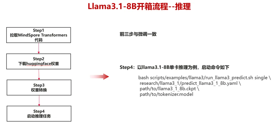 开发者基于MindSpore Transformers大模型套件,6小时完成Llama3.1-8b的微调及推理的迁移适配,并将代码开源至Gitee代码平台,面向所有开发者开放体验、调用,后续将同步上传至各大模型社区。