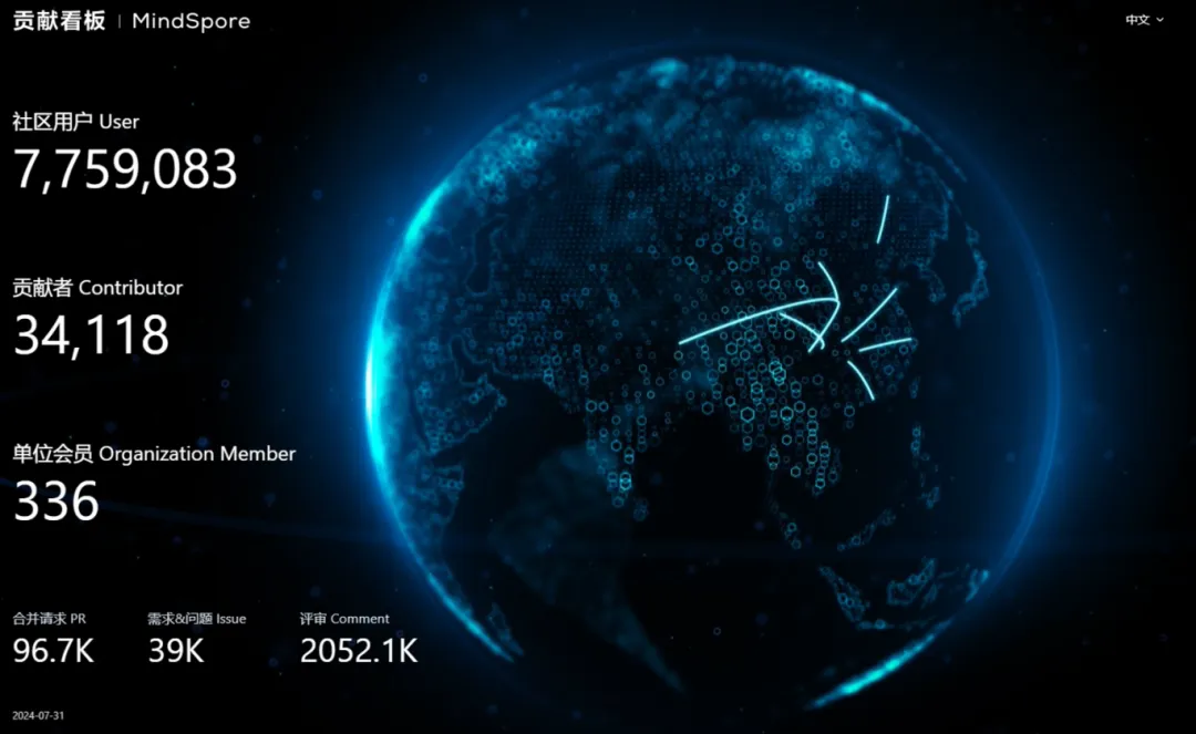 截至7月底,昇思MindSpore面向全球开发者,凝聚产业力量,持续打造人工智能创新之源。社区秉持开放透明原则,稳步建设开源生态,规模和活跃度得到持续提升。