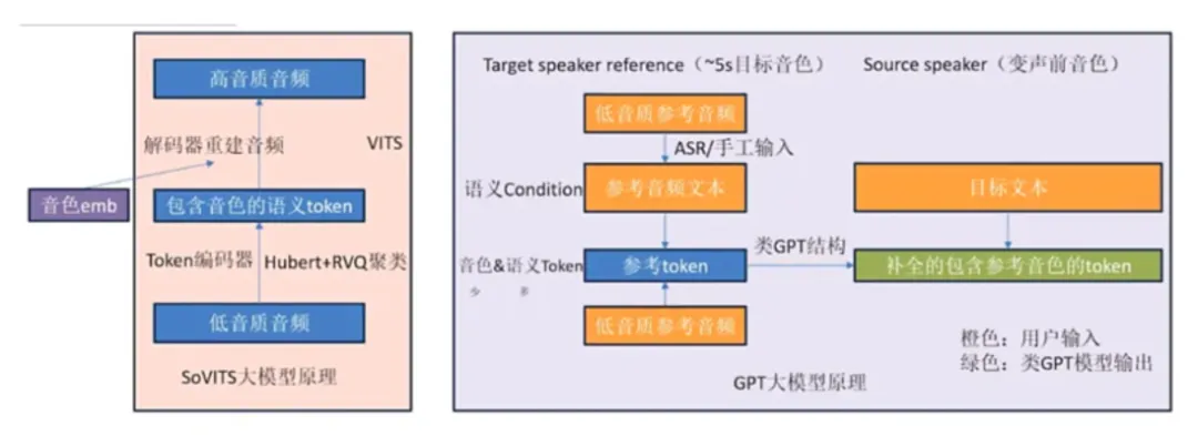 SoVITS的原理可以很简单地抽象为下图右边的编码器解码器结构。在重建的过程中模型将训练集音色学习进它的参数中,因此输入其他音色的语音经过编码后,VITS模型也能重建出学习过的音色的语音。