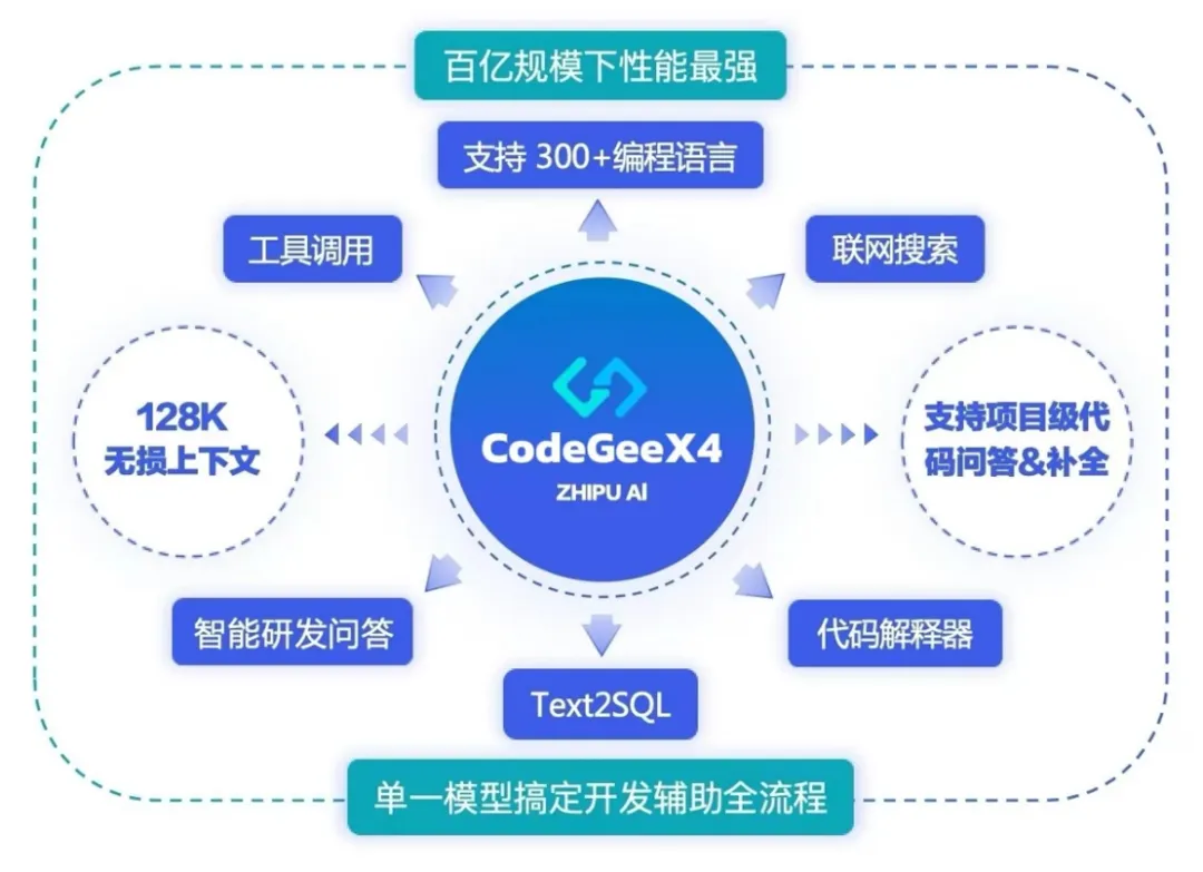 CodeGeeX4单一模型实现编程开发全流程覆盖,包括需求设计、前端开发、后端开发、数据处理等场景,支持代码补全和生成、代码问答、代码解释器、工具调用、联网搜索、项目级代码问答等全面能力。模型长序列达128K,支持中文、英文、俄语、法语、西班牙语等20+自然语言和300+编程语言。同时,在模型推理可实现单卡部署,最低24GB显存即可进行量化推理,用户可在本地私有化部署,保护企业代码安全。