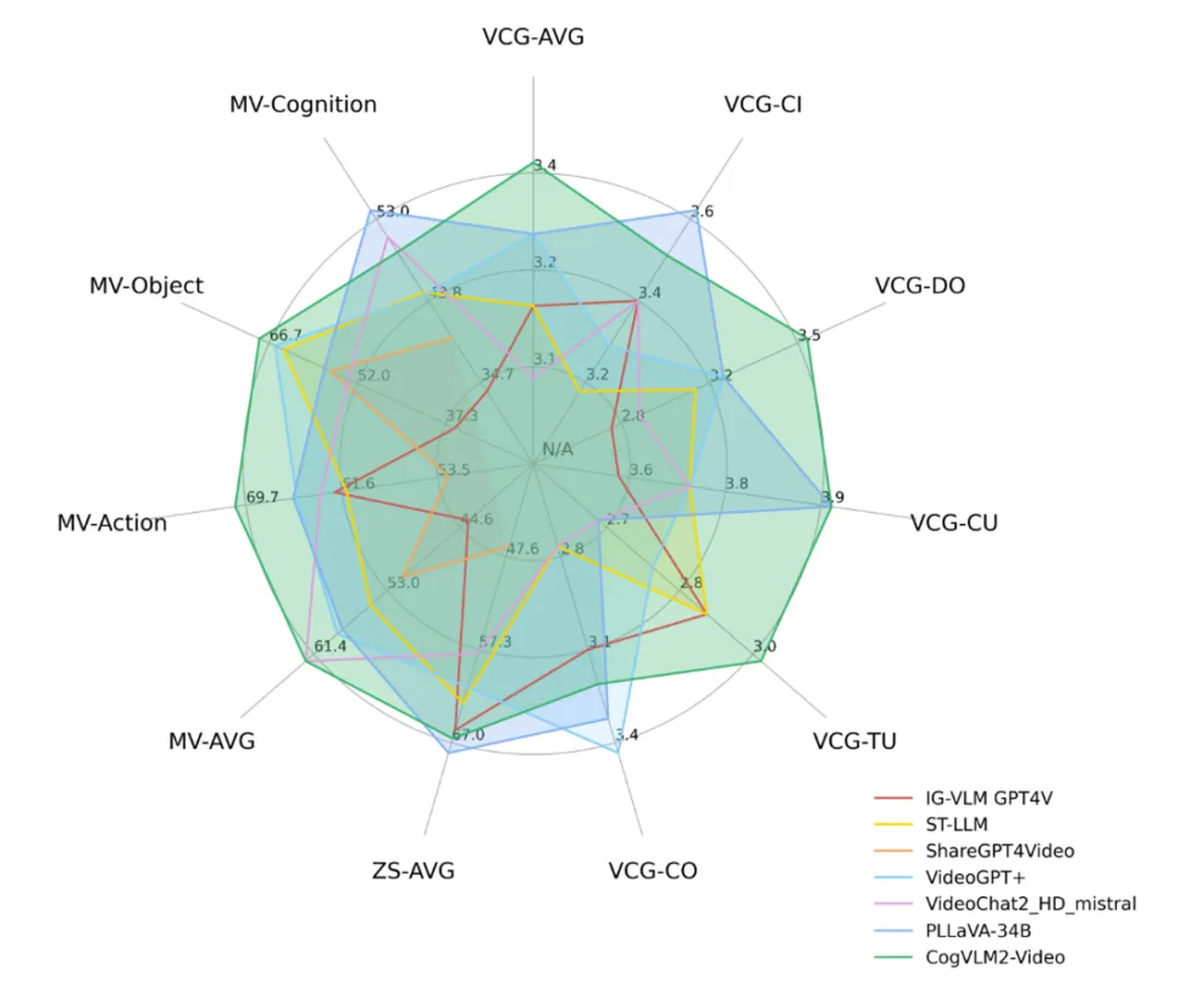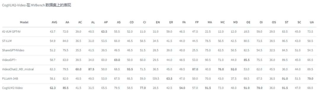 多模态大模型CogVLM2-video实现视频生成文本能力,支持2K序列长度、224×224分辨率的视频理解以及中英文回答等功能。测试实践显示,CogVLM2-video在多个视频问答任务上达到了 state-of-the-art (SOTA模型)的性能,并能够实现一分钟内的视频理解,在几个主流性能测试数据集(MVBench, VideoChatGPT-Bench and Zero-shot VideoQA datasets)中,CogVLM2-video也表现不俗,展现出全面竞争力,同时在多类主要指标上完成对其他模型的领先。