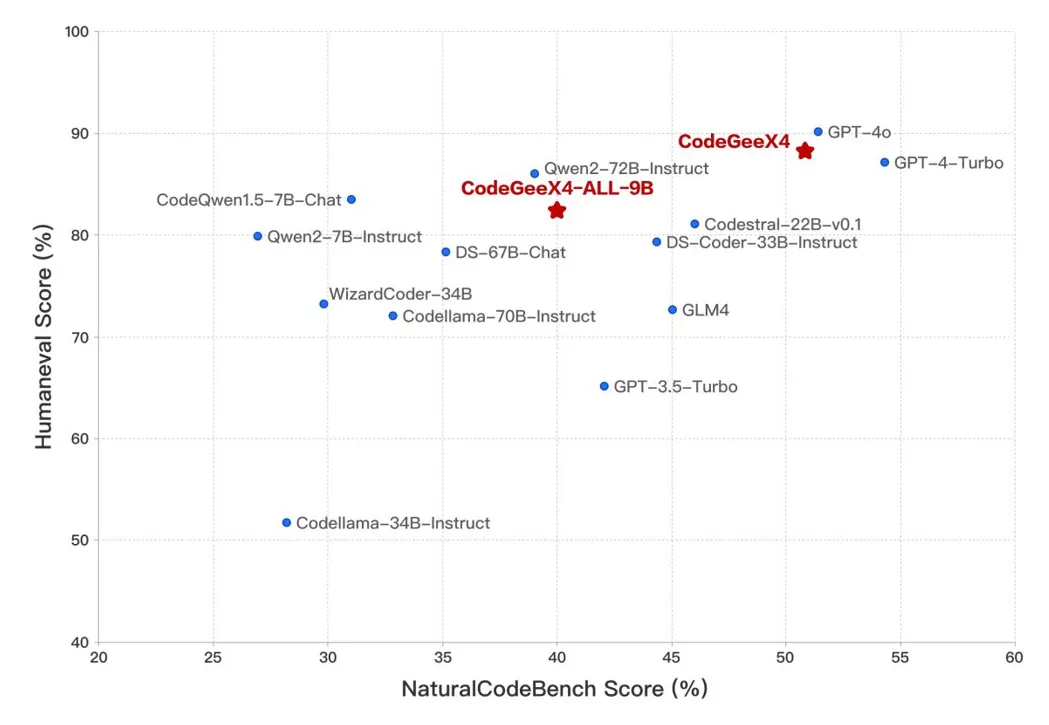第四代代码模型 CodeGeeX4堪称代码生成大模型的“六边形战士”,已经发布的CodeGeeX4-ALL-9B 仅用百亿级参数实现模型精度超越业界主流产品。在NaturalCodebench等测试基准上,相对于更大的模型实现了性能反超。