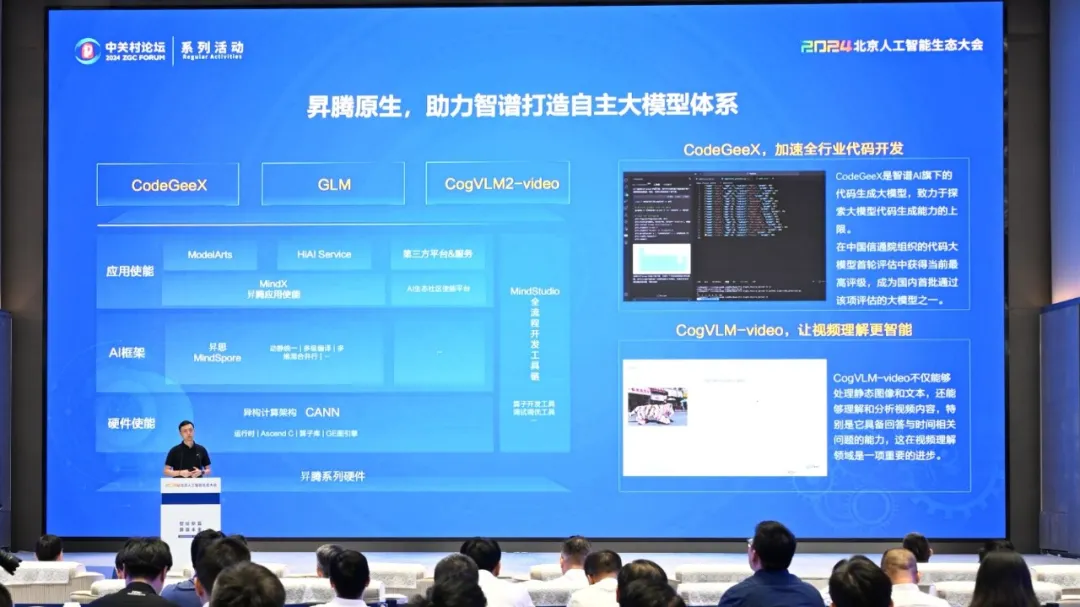 【北京】2024年8月19日,北京人工智能生态大会在中关村国家自主创新示范区会议中心颐和厅成功召开。会上,华为昇腾计算业务副总裁刘鑫发表演讲介绍昇腾原生进展,智谱CEO张鹏作专题分享,张鹏简要介绍了昇腾对自主创新的智谱大模型的助力,以及正在打造的基于昇腾的第四代代码模型CodeGeeX4和多模态模型CogVLM2-video。