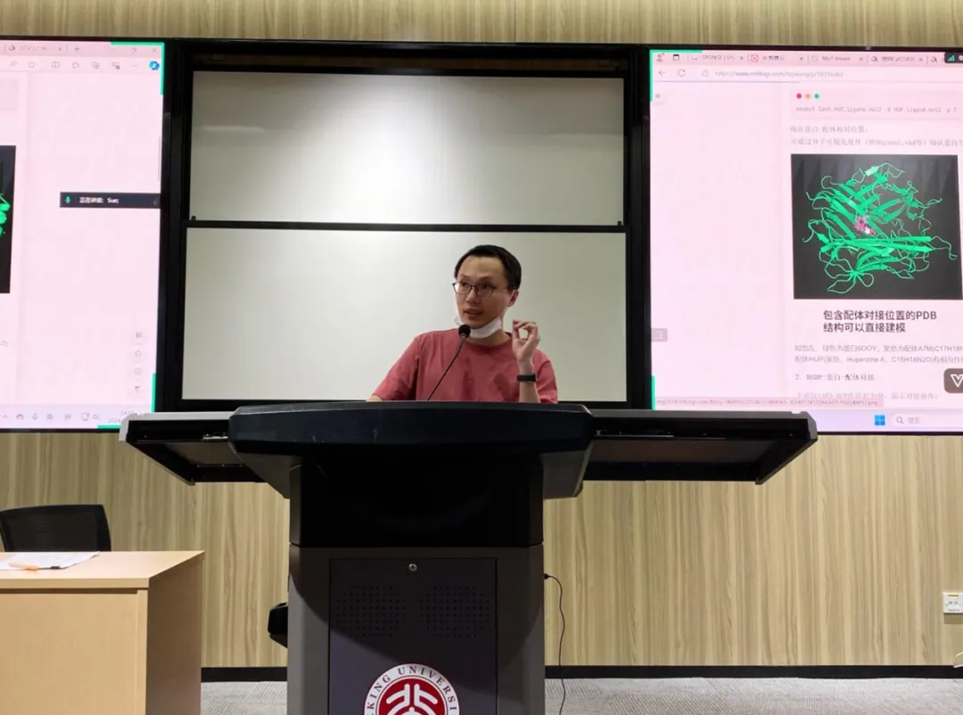 下午,深圳湾实验室助理研究员李茂东上机演示了用DSDP软件进行蛋白质和小分子配体对接并用SPONGE分子动力学模拟进行对接后的能量极小化的案例,随后深圳湾实验室工程师陈迪青向同学们演示了配体对接结果的可视化过程。