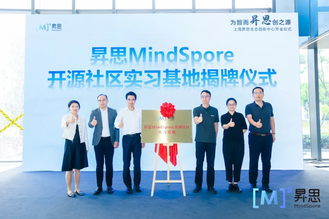 临港集团科投总经理助理、投资管理中心总监张馨尹,漕河泾总经理助理、科技创新与人才发展事业部总经理黄静,华为上海战略与Marketing部长房思哲,华为昇思开源生态总监杨滔,商汤大装置生态总监刘远辉,上海昇思生态创新中心总经理杨浩为昇思MindSpore开源社区实习基地揭牌。