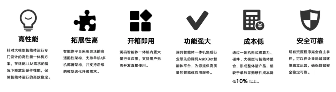 为了做到开箱即用,澜码智能体一体机深度整合了适配昇思MindSpore的澜码智能体平台AskXBOT、定制模型与昇腾硬件,为企业用户提供全私有化专属大模型及可快速搭建应用的智能体平台,凭借其对大语言模型深度的技能封装能力和直观的开发工具,企业无需从零开始,就可以快速构建和部署自定义的智能体(AI Agent),不仅可以显著缩短开发周期,还可以大大降低开发成本,确保企业在高速发展的AI领域始终保持领先。