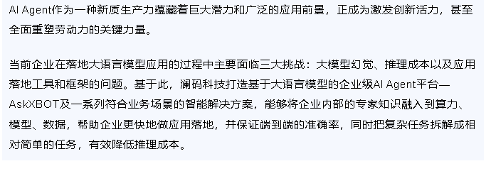 澜码科技作为一家基于大语言模型的企业级AI Agent平台公司,核心团队成员来自Google、IBM、腾讯、字节、阿里、依图等国内外知名互联网和AI公司。率先填补了国内大模型中间层的空白,是国内探索大语言模型应用落地和AI Agent的先行者。基于底层大语言模型,澜码科技自主研发了能够连接人和系统的企业级AI Agent平台“AskXBOT”,助力企业构建基于专家知识的超级自动化,从而提升业务质量和效率。