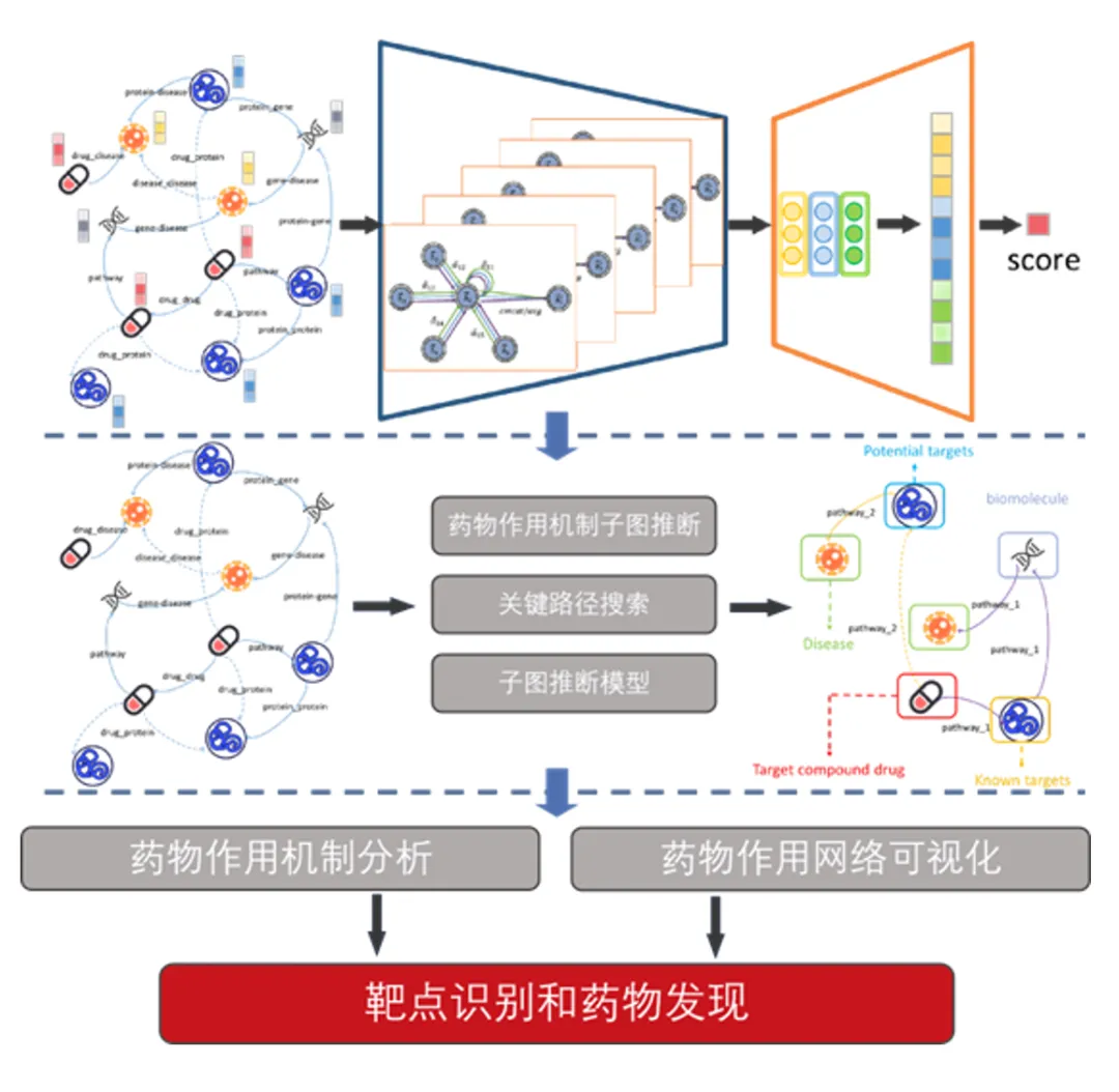 3、**药物作用机制推断:**根据作用网络进行药物与疾病之间的双向推断,揭示药物作用机制。
