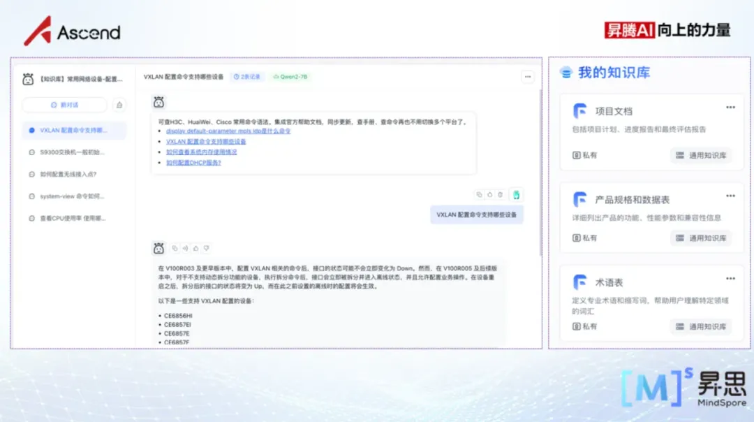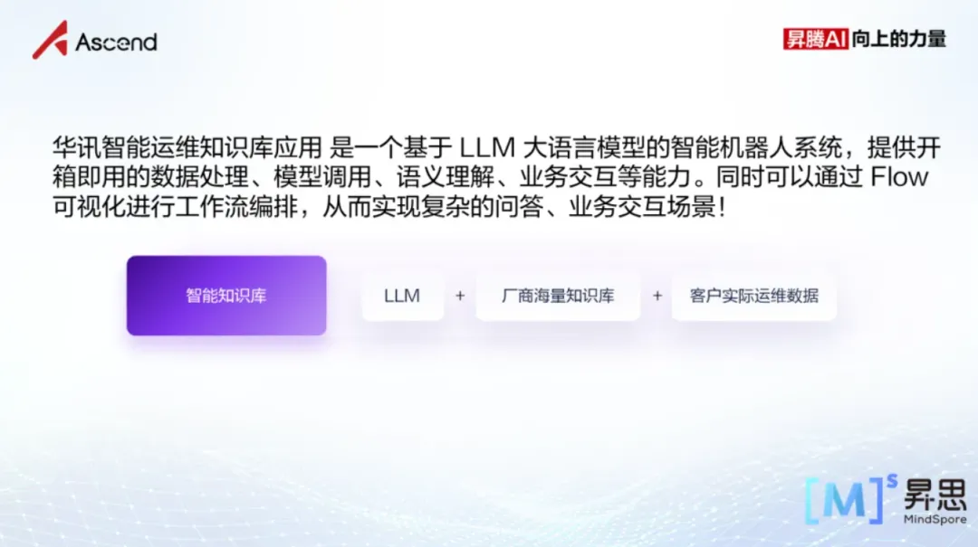 通过昇思MindSpore和昇腾AI处理器对现有LLM大语言模型结合厂商海量知识库以及客户实际运维数据进行训练,形成客户可直接互动问答的运维知识库大模型,从而助力客户运维工作效率的提升。