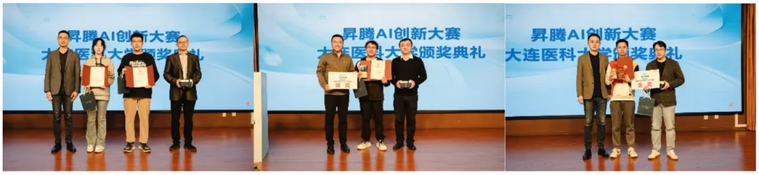 在颁奖典礼上,华为技术有限公司、大连人工智能计算中心、大连医科大学康养学院为学校在昇腾AI创新大赛2024大连区域赛中获奖队伍颁奖,其中由宋涛老师指导、李晓东副院长带队的大连医科大学康养学院颌面发育多组学建模团队,将代表大连出战全国赛。