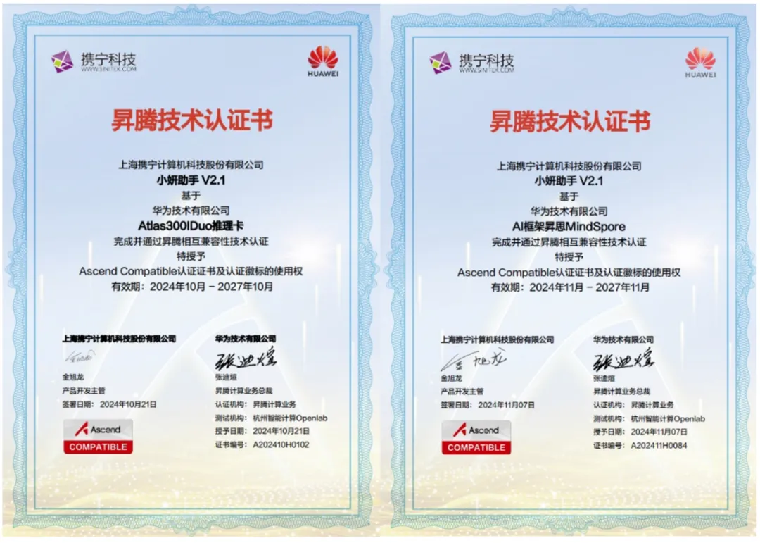 近日,携宁科技基于AI智能体技术自主研发的“小妍助手”系列工具,成功通过了昇腾和昇思兼容性技术认证!这不仅体现了携宁在技术领域的实力与成就,更是“小妍助手”系列工具提供人工智能适配方案的重要里程碑。自此,“小妍助手”产品正式成为昇腾生态体系的一员,携手并进,共同推动人工智能产业的繁荣发展。