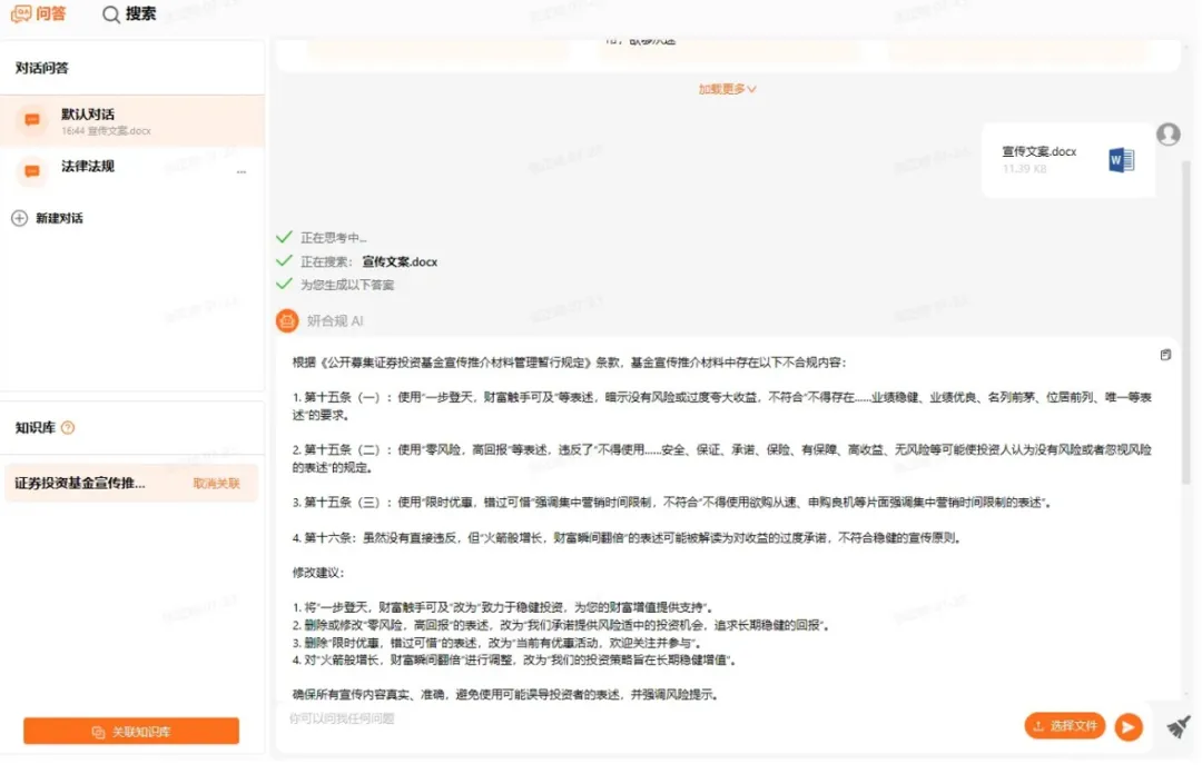 “法律法规助手”,基于金融法律法规资料,一方面为用户提供快速且低成本的法律法规智能问答服务,提升用户查询、整合法律法规条文的效率;另一方面为用户提供宣传文案、公司公告、产品合同等文本的合规性检查服务,识别违规内容与违规条例,给出修改建议,减轻合规检查的负担。