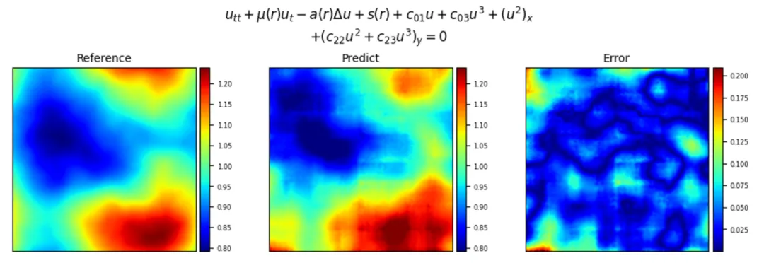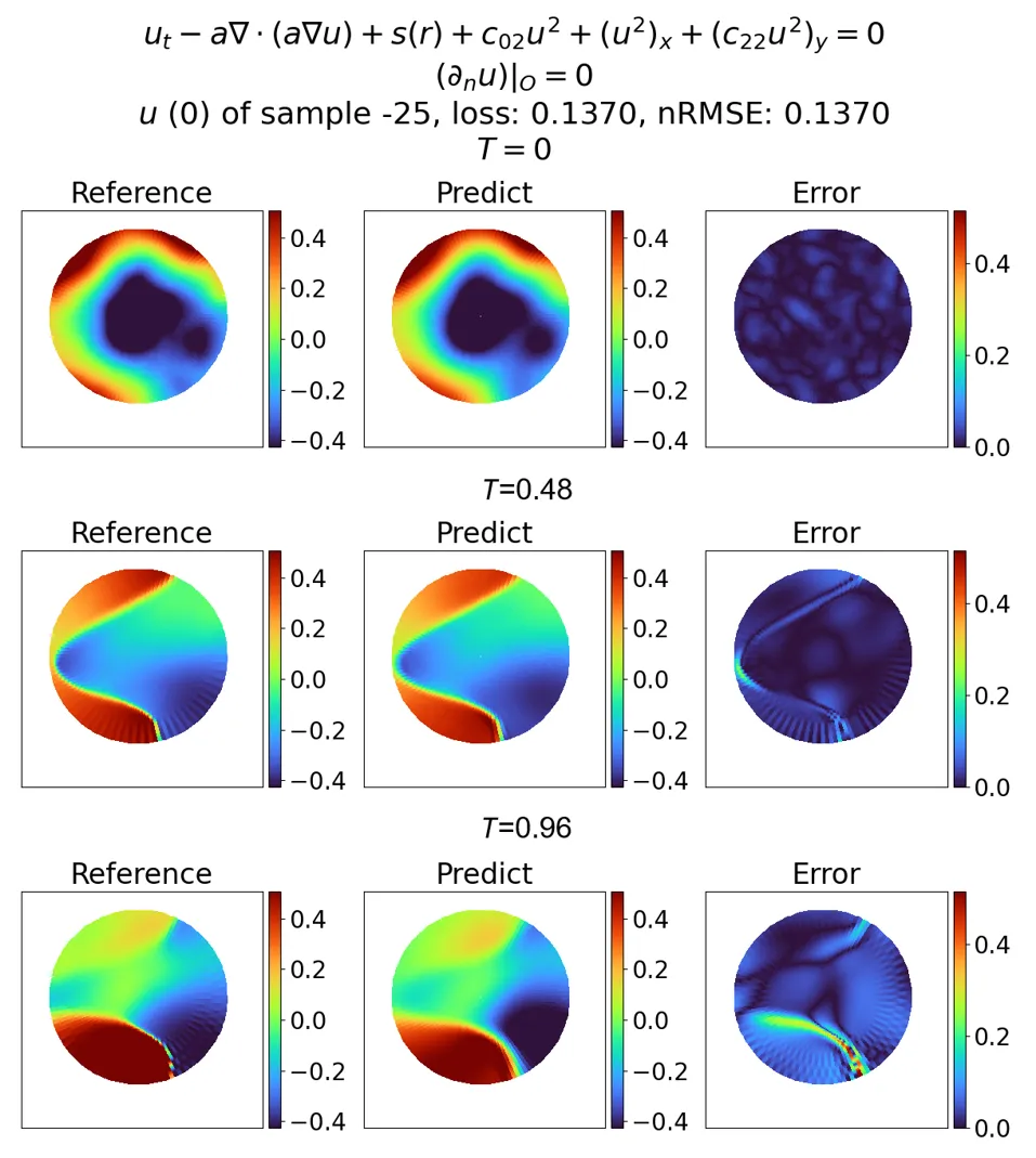 会上,北京大学董彬教授发布了其团队联合华为 AI4SCI Lab 基于昇思MindSpore AI框架开发的PDEformer-2模型。PDEformer-2是一种可以直接处理任意 PDE 形式的端到端解预测模型,同时适用于含时与不含时的方程。模型使用约 40TB 的数据集进行预训练,能够对具有不同边界条件、求解区域、变量个数的二维方程直接推理,快速获得任意时空位置的预测解。此外,PDEformer-2 作为正问题解算子的可微分代理模型,也可以用于求解各类反问题,包括基于有噪声的时空散点观测进行全波反演以恢复方程中的波速场等。这为模型支持包括流体、电磁等领域的众多物理现象及工程应用的研究打下良好基础。