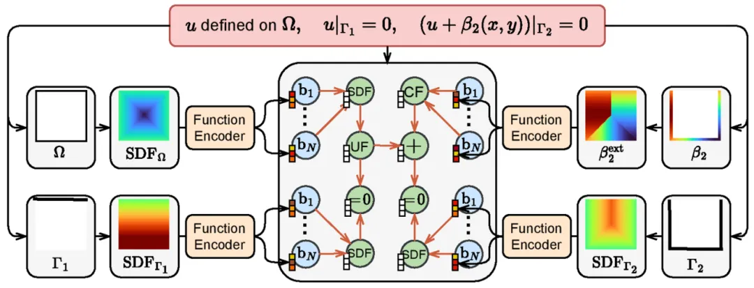对于二维方程中可能出现的复杂区域形状和边界位置,PDEformer-2 将其表示为符号距离函数(SDF),并使用函数编码器将这部分信息嵌入到计算图当中。下图所示的例子展示了使用计算图表示方形区域上 Dirichlet 边界条件的方式: