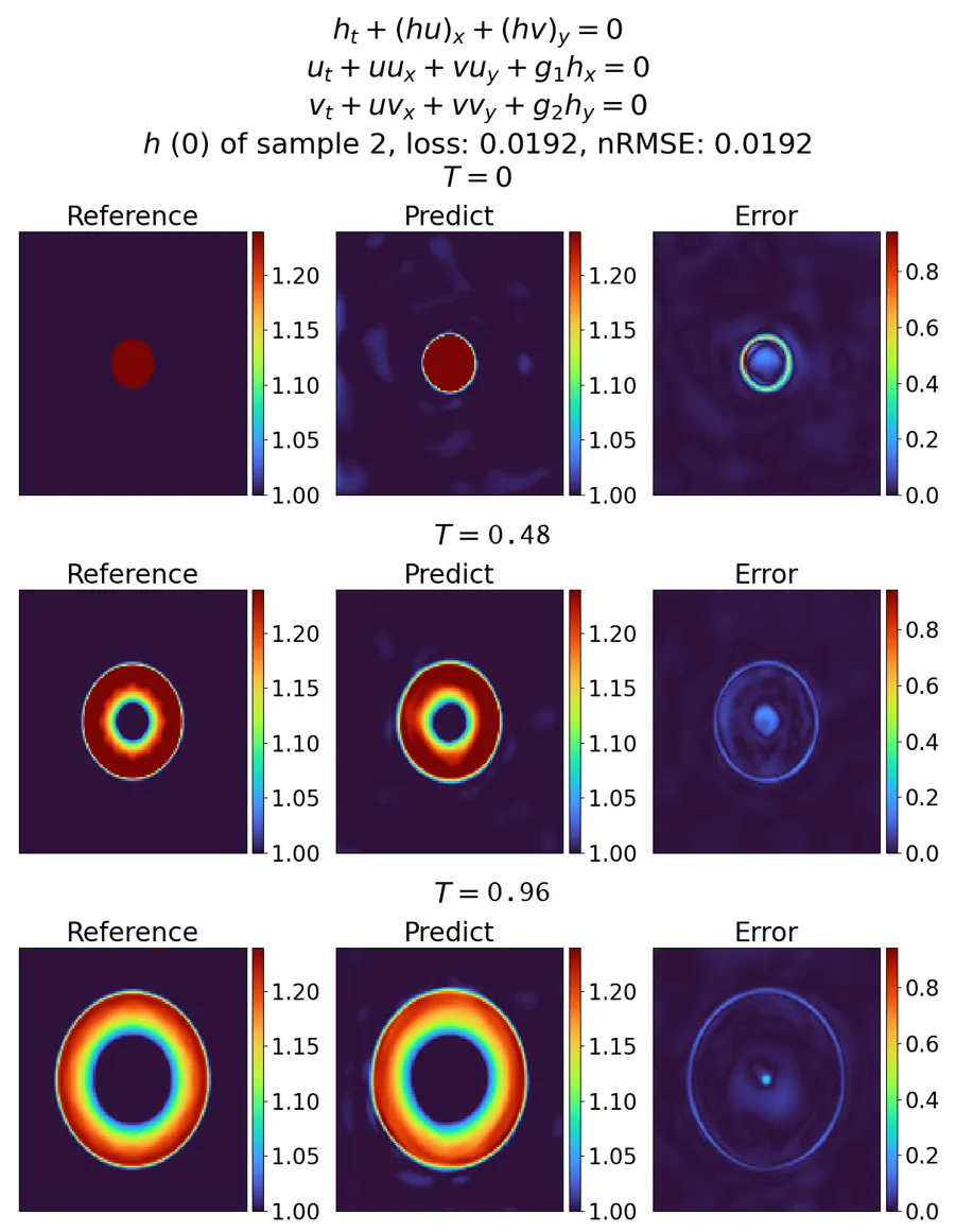 充分的预训练不仅允许模型对预训练分布内的方程进行高效的推理,也为微调适应分布外的方程打下了良好的基础。团队使用 PDEBench 基准数据集提供的浅水波数据对模型进行了微调,其中所使用的分片常数初值在模型的预训练过程中并未出现。尽管微调过程仅仅使用了一个样本,模型还是迅速地适应了这一数据集的物理场景,在测试集上达到了仅 3.60% 的相对误差。其中一个测试样本的预测效果如下图所示: