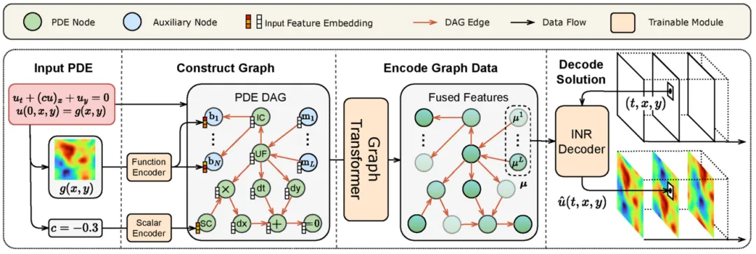 如图所示,PDEformer-2 先将方程形式表示为一个计算图,利用标量、函数编码器将方程涉及的数值信息嵌入到计算图的节点特征当中。接下来,PDEformer-2 通过 graph Transformer 编码这一计算图,并使用隐式神经表征(INR)对所得的隐向量进行解码,获得 PDE 的各个解分量在特定时空坐标下的预测值。