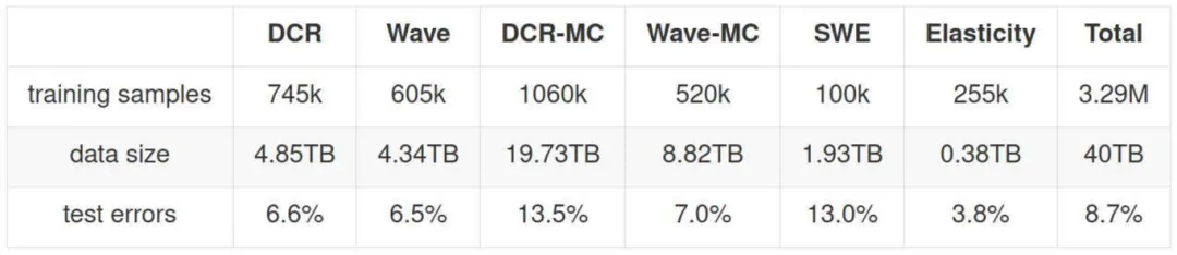 团队为 PDEformer-2 的预训练准备了大规模、多样化的数据集,其中包括时间一阶的反应对流扩散(DCR)方程与浅水波(SWE)方程,时间二阶的波动方程及其多分量(MC)版本,以及不含时的稳态弹性力学方程。这些数据分别使用开源软件包 Dedalus 和 FEniCSx 生成,涵盖了不同方程定义域、边界条件和解分量个数的样本。数据集的规模与预训练后的模型精度(nRMSE)如下表所示: