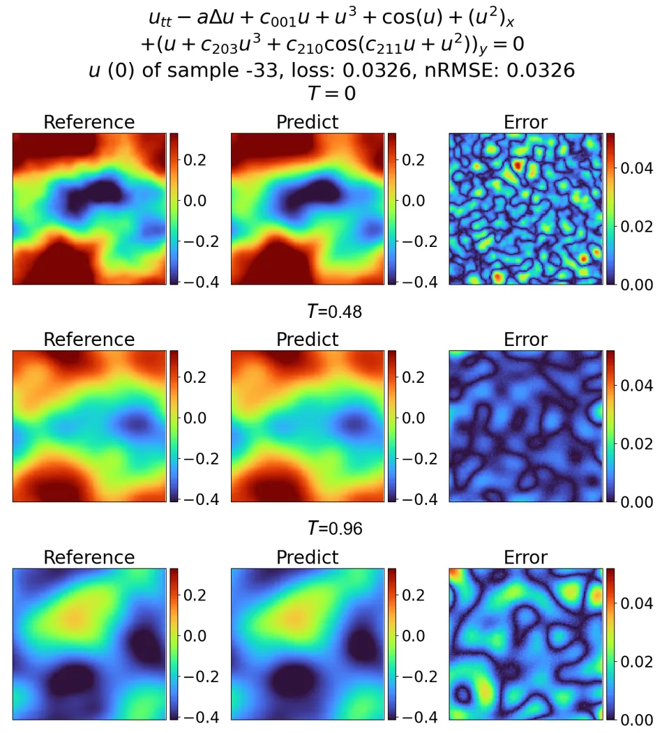 在这一出色结果的基础上,团队再接再厉,开发了针对二维 PDE 的通用求解基础模型 PDEformer-2。模型使用大规模、多样化的数据集进行预训练,获得了强大的求解能力,能够直接求解具有不同边界条件、区域形状、未知变量个数的二维方程。对于预训练分布外的场景,PDEformer-2 也展现出了强大的小样本学习能力,能利用有限的微调数据迅速适应新的方程求解任务。此外,PDEformer-2 作为正问题算子的可微分代理模型,还能用于各类反问题的求解,基于有噪声的时空散点观测估计方程中的常数系数、源项场和波方程的波速场。
