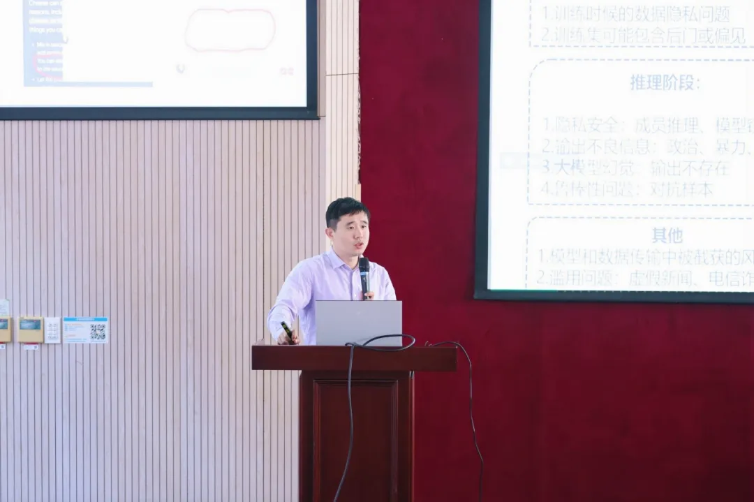 下午,首先由中科院信工所02体系结构安全研究室副主任孟国柱为大家介绍了大模型系统漏洞利用技术,从大模型越狱角度分析了当前大模型应用/系统所面临的威胁与防御方法。随后,华东师范大学软件工程学院教授、博导陈志立为同学们介绍了基于差分隐私与安全多方计算的深度学习隐私保护技术。随后,南京大学计算机软件新技术全国重点实验室教授、主要学术骨干许封元从信息熵约减、异构安全融合、web3.0等维度探讨了面向智能计算的安全与隐私保障技术。