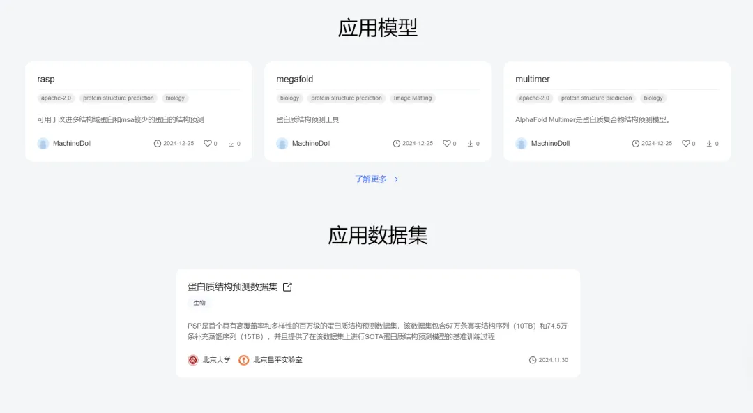 以上案例中所涉及到的模型,均可在该专区中找到。更值得一提的是,由北京大学、北京昌平实验室提供的蛋白质结构预测数据集,首次在生物人工智能专区中发布。