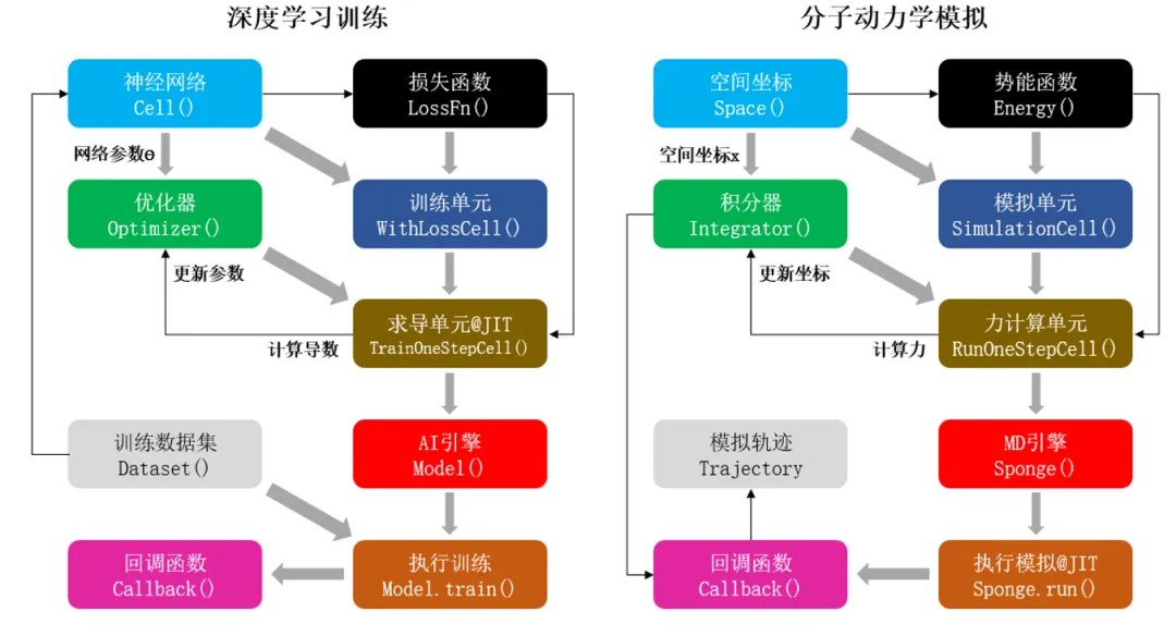 分子模拟软件多用C/C++和FORTRAN编写,而AI框架多以Python为主,导致AI算法难以集成在分子模拟软件中。MindSpore SPONGE通过将MD模拟程序视为AI训练过程,原子坐标相当于神经网络参数,势能函数相当于作为优化目标的损失函数,而MD积分器则相当于一种特殊的AI优化器。根据这种相似性逻辑,分子模拟程序可以自然而然地在AI框架中重构,AI原生分子模拟程序MindSpore SPONGE可以充分发挥昇思MindSpore作为AI框架的强大能力,提供了可微编程、高通量计算和自动硬件迁移等非常有吸引力的功能。