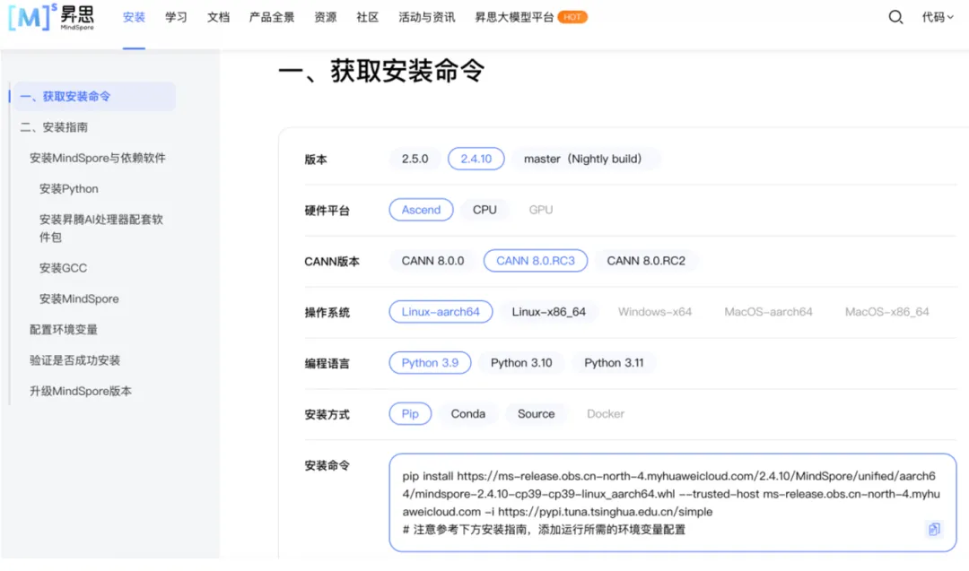 安装完成后开始安装MindSpore2.4.10版本,进入MindSpore官网:https://www.mindspore.cn/。