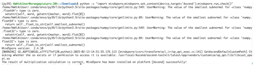 python -c "import mindspore;mindspore.set_context(device_target='Ascend');mindspore.run_check()"