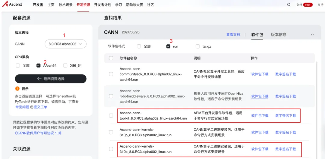 在开发板系统中,进入官网(https://www.hiascend.com/developer/download/community/result?module=cann&cann=8.0.RC3.alpha002),按照下图中的标注进行筛选。