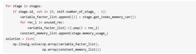 由此,只要通过Dryrun等手段得到足够多的stage峰值内存,就可以通过方程组求解完成对内存的分解。在代码中可以通过numpy方便地实现这一逻辑。