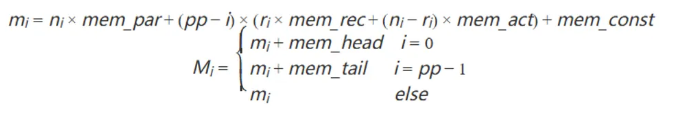 Dryrun是MindSpore提供的一种能够模拟实际执行的工具,除了真实的在硬件上执行计算和通信,Dryrun可以完美模拟AI框架的构图、编译、内存分配的过程,其输出的内存预估和真实执行之间的误差非常小。在最终的方案中,我们通过提前进行一次Dryrun获得每个stage的真实内存,再把真实内存通过线性方程组的方式进行分解。由于算法最终的输出是每个stage中的layer分配以及重计算策略,内存可以被分解到layer和重计算的层面上。假设有一个stage数为pp的流水线,每个stage的内存值为M,stage中的layer数为li,重计算层数为ri,i为stage id。内存将被分解为如下几项: