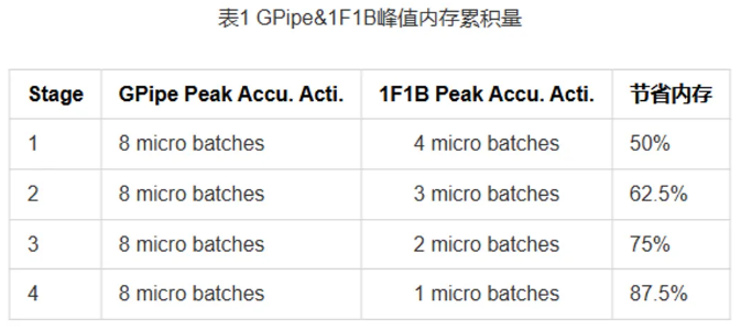 PipeDream在GPipe batch-forward-batch-backward的编排基础上提出了一种新的编排方式,1-forward-1-backward(1F1B)(图5上半部分),流水线在一个前向处理完成后便可以开始计算反向,这样激活值在反向执行后就可以及时释放,相比于Gpipe提高了内存使用效率,增加micro batch的数量不再会对设备上的峰值内存有影响。在这种1F1B的编排方式之下,流水线的最小bubble为(p-1)/m,p和m分别是流水线stage数和micro batch数。性能持平GPipe的同时进一步节省了内存压力。以下表为例,当micro batch数量为8的时候,stage = 4的流水线并行最少也能为设备节省50%的内存。