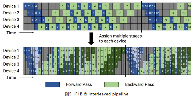 Megatron团队在2021年提出了流水线交织(interleaved pipeline)的排布方式(图5下半部分),这是一种基于1F1B的优化,通过把一个设备上原本连续的layer继续分割成多个chunk,进一步细化了流水线的颗粒度,进一步压缩bubble到(p-1)/vm,v是每个stage切分出的chunk数。当stage = 4时,如果micro batch数为16,理论上1F1B下bubble最小占比为18%,而分出两个chunk之后,bubble的占比极限下可以进一步被压缩到9%左右。不过,流水线交织并不能解决内存不平衡,只是引入了新变量chunk,导致调优又新增了一个维度,复杂度几何级上升。