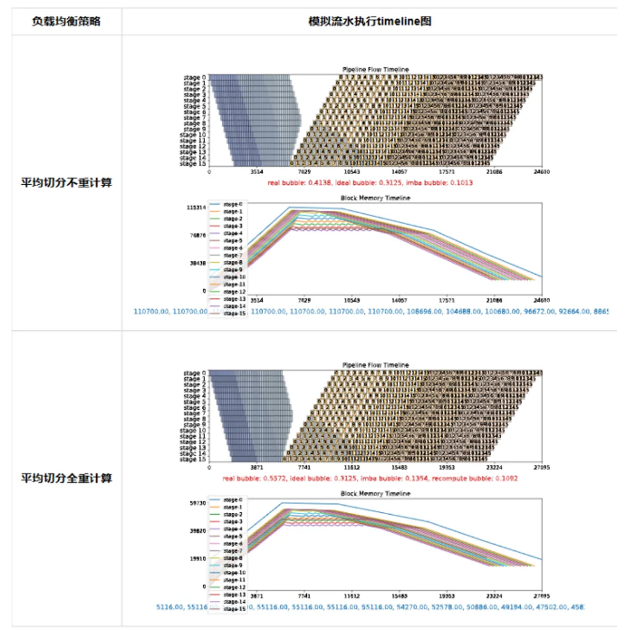 当模型参数量来到了671B这样的规模,即使配置pp=16,将模型的layer平均切分到每个stage时,设备内存压力仍然较大,因此只能选择开启完全重计算。表中图示展示了流水执行的模拟示意,蓝色方框为正向计算,黄色为反向计算,纵轴表示16个stage,横轴表示时间,下面的红色real bubble代表bubble相比于真实计算时间的比值,real bubble越大,预估性能越差。