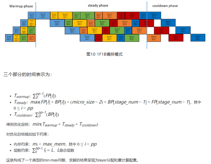 按照上面两节描述的方式分解出了性能和内存信息之后,通过整数线性规划建模流水线并行的编排模式,就可以衡量不同的配置对性能和内存的影响。以设备的内存作为约束条件,以最小化端到端训练时间为目标,可以自动求出最优的layer分配和重计算策略。这里需要考虑的是如何对端到端时间建模。原封不动地刻画layer间的依赖关系是一种自然的思路,但在复杂的调优条件下这种建模方式的时间复杂度很快就会超出可接受的范围。实际上,如果考虑1F1B自身的性质,就可以简化问题、分组描述,降低复杂度。