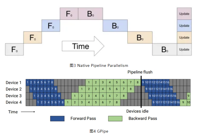 图1展示了最简单的流水并行切分,将模型的层进行了切分,分布在不同的设备上,虽然节省了内存占用,但是可以很明显的看到非常大的bubble,在实际训练时性能会非常差,因此在实际训练中基本上不会直接使用native pipeline。谷歌为了提高流水线的效率,提出了Gpipe,如图2所示,设备上的训练数据被分成了更细的micro batch,不同的micro batch可以并行计算,这样就压缩了训练过程中的bubble,提升了训练性能。