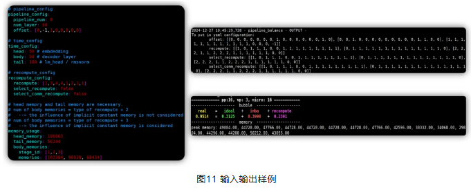 负载均衡工具的寻优流程如下图所示,yaml文件中包含的时间和内存信息会被工具中的parser模块所分解,构成一套抽象表征提供给算法的interface。求解出来的策略以一种兼容MindSpore TransFormers配置的格式给出并给出这个配置的bubble比例(上图右),这个策略可以直接提供给MindSpore TransFormers使用,同时工具也包含了一个流水线模拟器,会根据算出来的策略模拟出性能和各个stage的内存占用(下图右下角)。