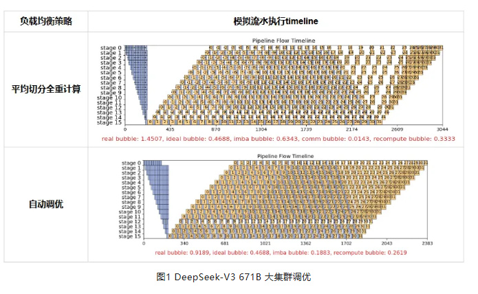 面对DeepSeek一类的异构模型,流水负载均衡工具可以有效兼容。表3展示了DeepSeek-V3 671B 大集群调优的实例。