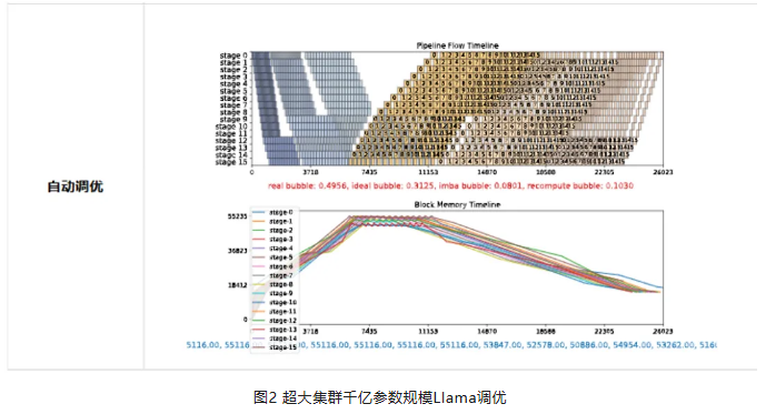 图2中共有三种流水线负载均衡配置,分别是对layer进行平均切分,且不开启重计算;平均切分开启全部重计算以及经过自动负载均衡调优后的策略。 最终通过超大集群实测,自动负载均衡调优相比于专家调优提升性能14%。