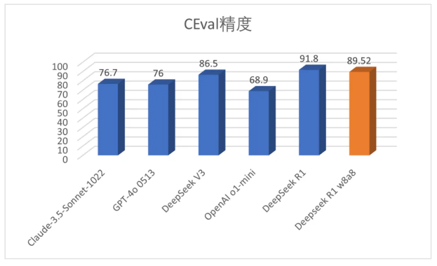 压缩模型工具(金箍棒)针对开源大模型,根据用户及硬件能力可进行适当定制量化,本方案使用8bit权重量化、SmoothQuant 8bit量化和混合量化等技术,最终以CEval精度损失2分的代价,实现了DeepSeek-R1w8a8的大模型部署。