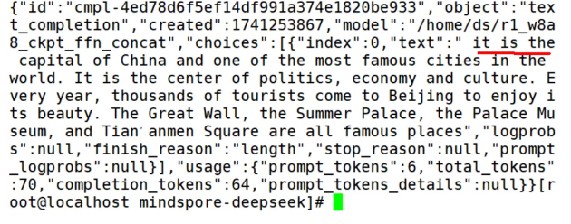 curl http://主节点ip:推理服务端口/v1/completions -H "Content-Type: application/json" -d '{"model": "模型路径", "prompt": "I love Beijing, because", "max_tokens": 32, "temperature": 0, "top_p": 1.0, "top_k": 1, "repetition_penalty":1.0}'