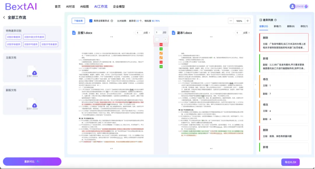 针对合同、报告等文件的精细化比对需求,DeepSeek R1&QwQ-32B等大模型突破传统规则限制,实现多格式智能解析与跨版本差异定位。系统可自动识别PDF、Word、扫描件中的文字、表格及签章区域,关键条款对比准确率达99.5%。以某企业合同修订为例,系统在3秒内完成200页中英文混合协议的版本比对,精准标注付款周期、违约责任等12类核心条款变动,人工复核耗时减少90%。