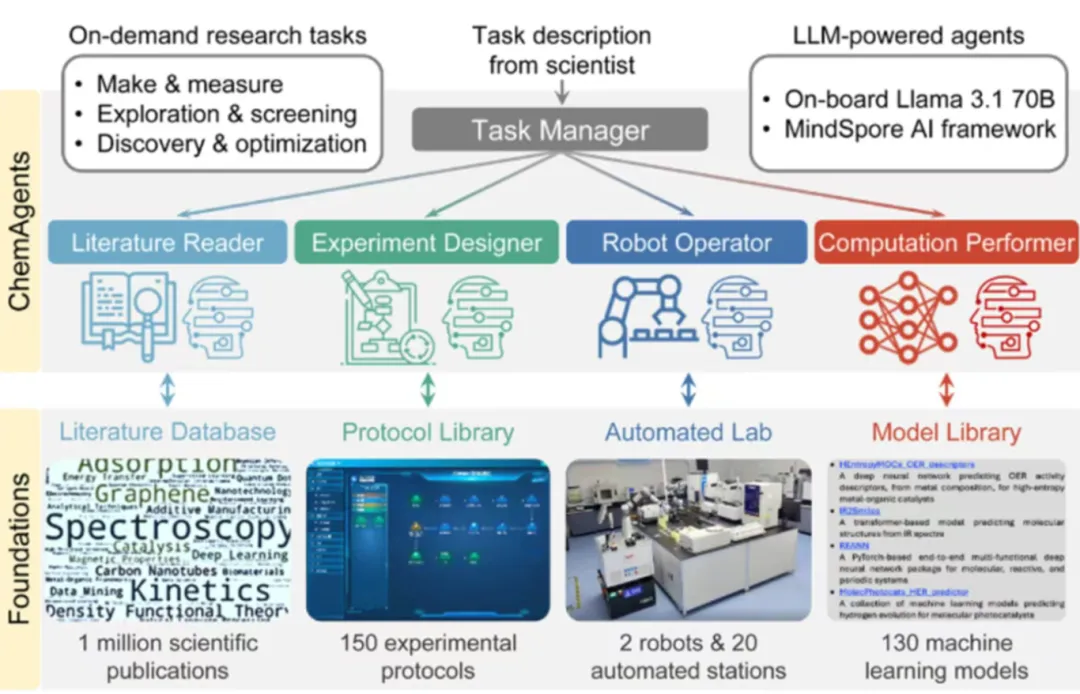 由中国科学技术大学罗毅、陈林江、张飞、尚伟伟、傅尧和江俊等组成的团队在《J. Am. Chem. Soc.》提出了一种名为ChemAgents的多智能体系统,结合了LLM和自动化机器人技术,能够自主执行复杂的化学实验,极大地减少了人为干预。通过多智能体的协作,ChemAgents不仅能够自主设计实验、执行实验,还能通过机器学习模型进行数据分析和优化,最终实现化学研究的全自动化。