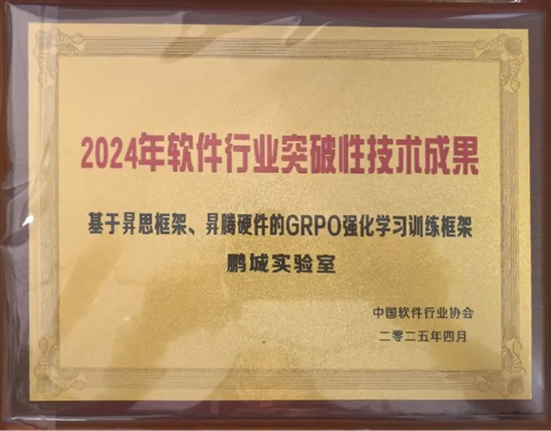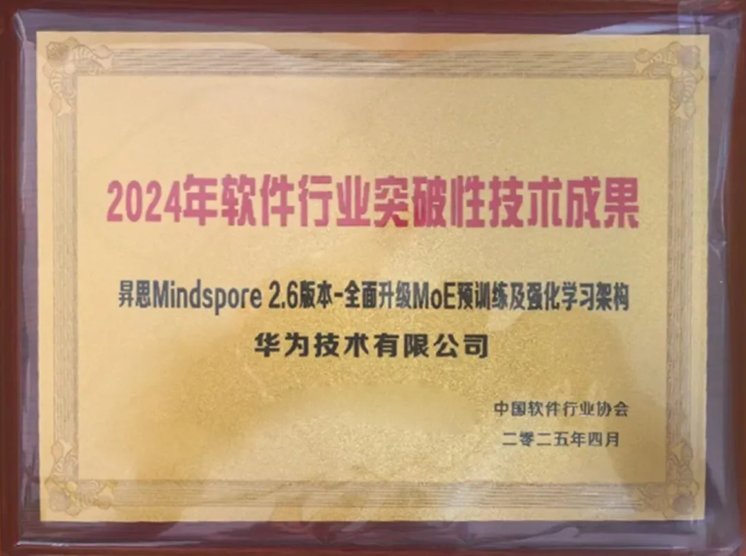 2025年4月24日,由中国软件行业协会主办的第四届中国国际软件发展大会在京召开。会上,昇思MindSpore AI框架全新发布的MindSpore 2.6版本、鹏城实验室发布的基于昇思MindSpore AI框架及昇腾AI硬件的强化学习训练框架GRPO-Training-Suite在本次大会上均荣获2024年软件行业突破性技术成果奖。