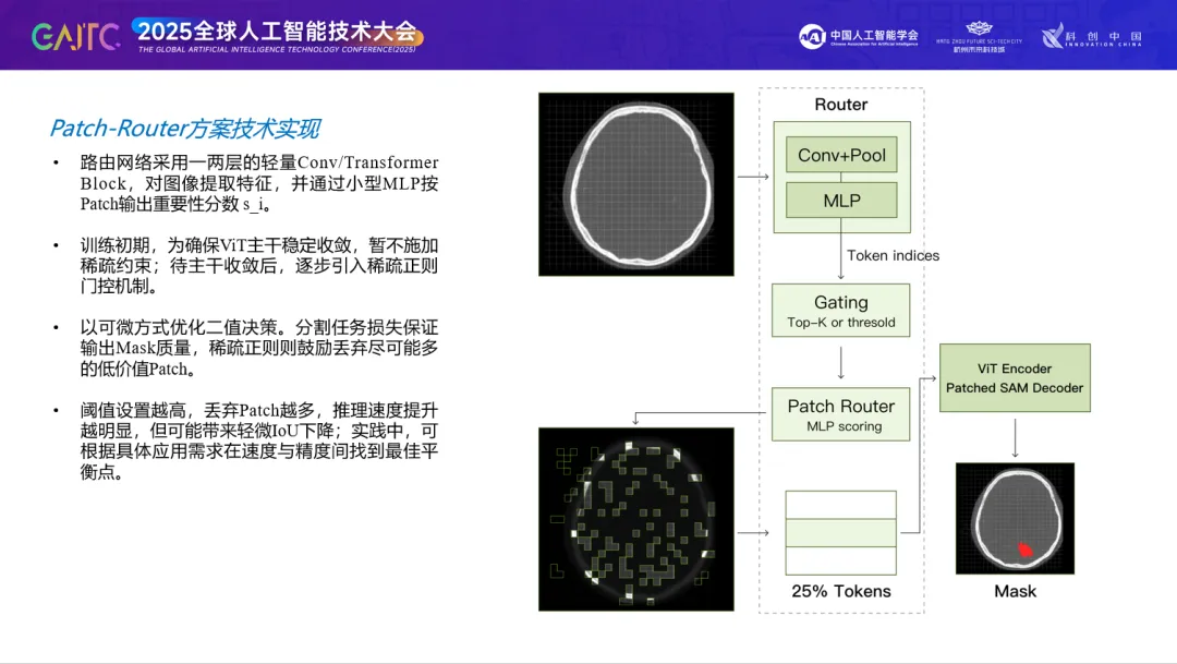 为解决当前模型在高清三维医学影像场景显存占用高、推理耗时长等实际应用难题,北京安德医智科技有限公司副研究员刘盼团队依托MindSpore框架,探索基于复合策略的多模态VIT模型推理加速方案。通过额外的轻量级路由网络,将原始图像的下采样特征作为输入,输出每个Patch的连续重要性分数。训练阶段,在保持原有SAM分割精度的基础上,通过联合“分割损失+稀疏正则”让路由网络学会剔除冗余区域。推理时,仅对得分高于阈值的Patch进行完整ViT编码,其余区域直接由SAM解码器通过位置插值等方式补全,从而有效提升模型在资源受限环境下的推理效率,降低部署门槛,为AI模型在基层医疗场景中的落地应用提供高性能、低成本的解决方案。